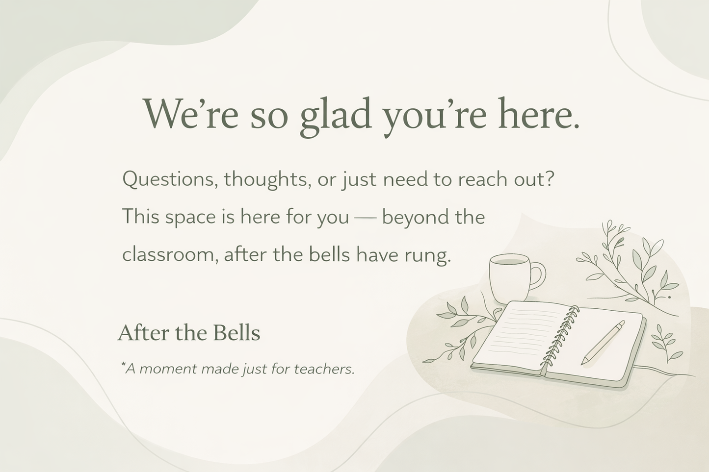 After the Bells was created specifically for teachers — the ones who give endlessly during the day and need a moment that’s just theirs after the bells have rung. If you teach, support, lead, or serve students in any way, this space is for you.